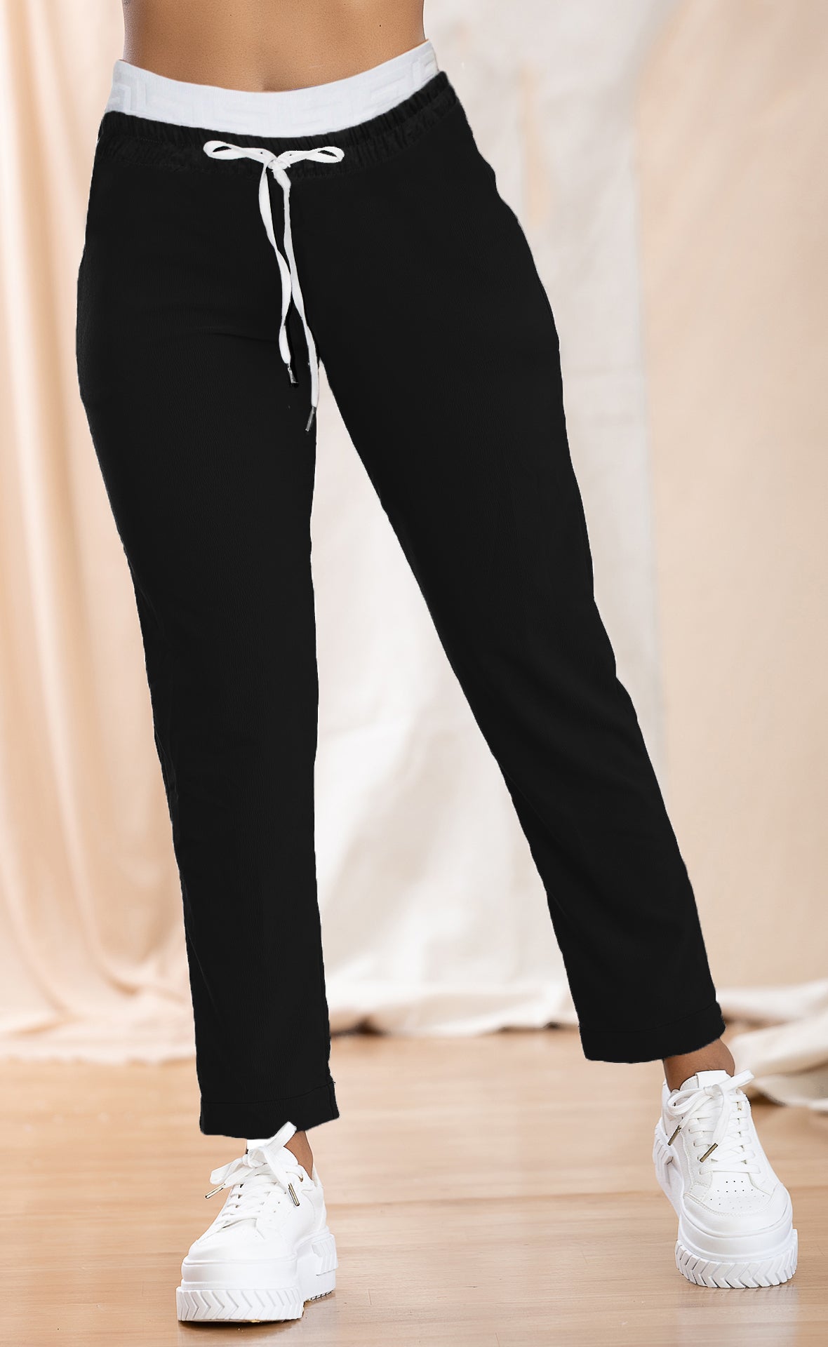 moderno y cómodo, ideal para el día a día. Este pantalones de chándal doble pretina que ofrecen un ajuste perfecto y una gran versatilidad, combinados con unas zapatillas blancas que aportan un toque fresco y contemporáneo. Perfecto para actividades casuales o deportivas, este atuendo refleja un estilo relajado sin sacrificar la elegancia.